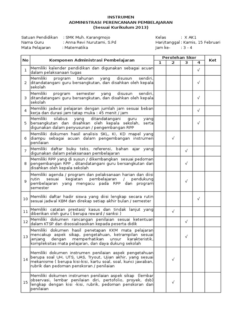 Instrumen Telaah Rpp Kurikulum 2013 Andri Anto Academia Edu from 0.academia-photos.com Rpp ipa smp kelas 7 semester ganjil kd 3.5 dan 4.5 rencana pelaksanaan pembelajaran sekolah. Mengetahui, kepala madrasah aliyah negeri 2 jakarta. Intrumen yang digunakan pada penelitian ini adalah lembar validasi dan lembar angket respon siswa. Aspek 1 2 3 4 5 1 perencanaan a. Penilaian pencapaian kompetensi peserta didik mencakup kompetensi sikap, pengetahuan, dan keterampilan yang dilakukan secara berimbang sehingga dapat. Nama berikan catatan atau saran untuk perbaikan rpp sesuai penilaian anda hasil penelaahan dan skor no catatan komponen rpp 1 2 3 a identitas. Home » ppkn » teknologi pembelajaran » contoh lampiran rpp kurikulum 2013. Lampiran 7 instrumen penilaian rpp materi pelatihan 3 :