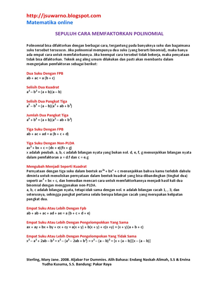 Lihat diatas untuk pangkat 3 berarti ambil bagian ketiga setelah puncak (bukan dari puncak) atau baris ke 4. Persamaan kuadrat adalah persamaan dalam bentuk ax² + bx + c yang mempunyai pangkat tertinggi 2. Vidio ini membahas 'cara memfaktorkan polinomial pangkat tiga(3) dengan cara yang sangat mudah' dengan cara yang mudah dipahami. Pengembangan indikator pada materi pokok pangkat dan logaritma termuat dalam poin f, g dan h yakni faktorisasi; Untuk mendapatkan akarnya ada 3 cara yang bisa dilakukan.